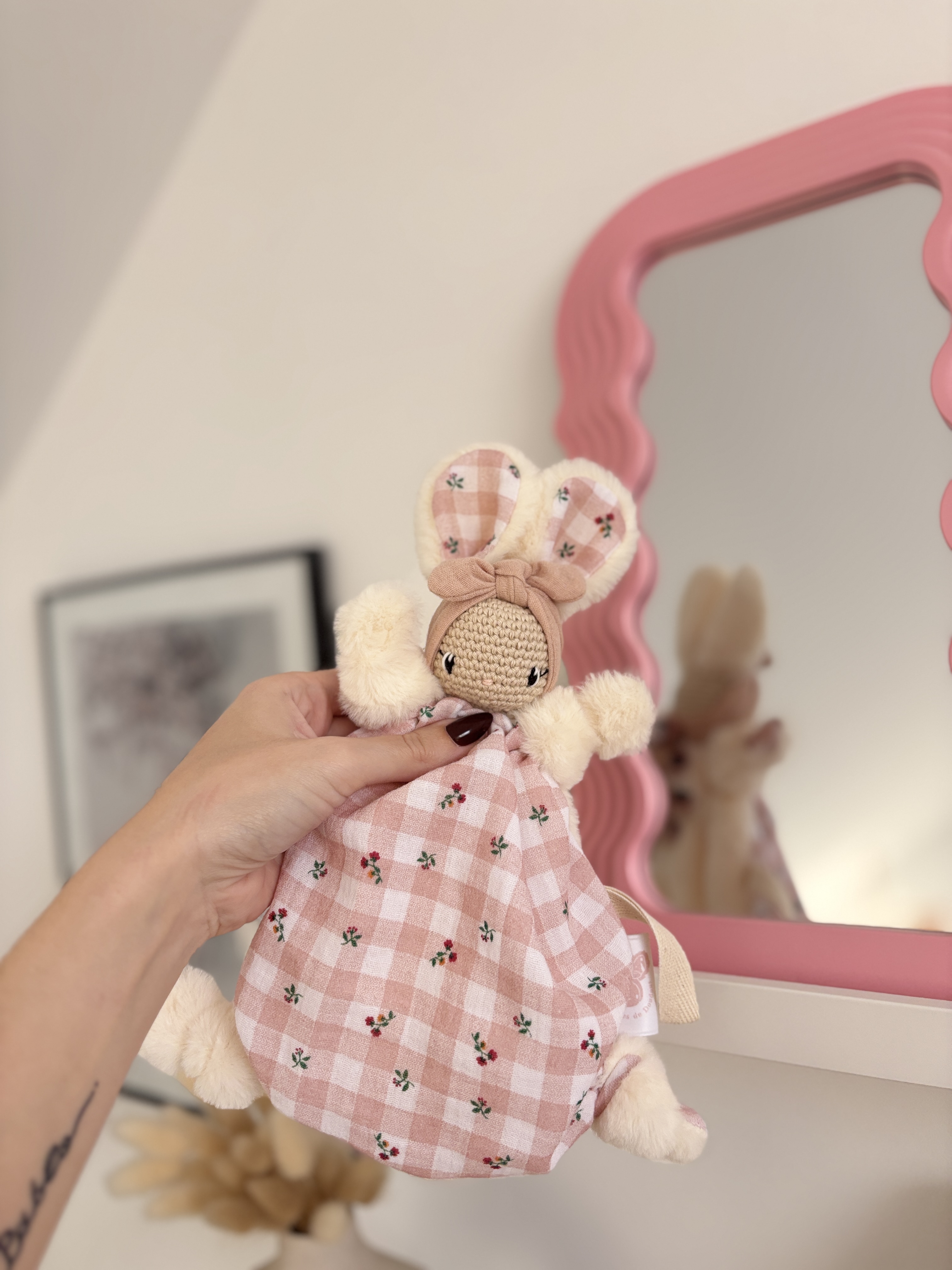 Chaque doudou est réalisé entièrement à la main, et est donc unique, il se peut donc que le doudou que vous recevrez présente des petites différences avec le doudou de la photographie.