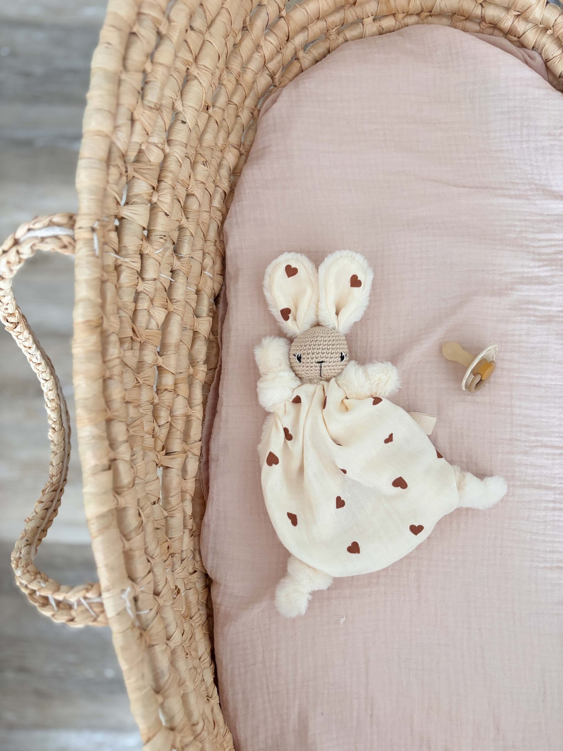 Chaque doudou est réalisé entièrement à la main, et est donc unique, il se peut donc que le doudou que vous recevrez présente des petites différences avec le doudou de la photographie.