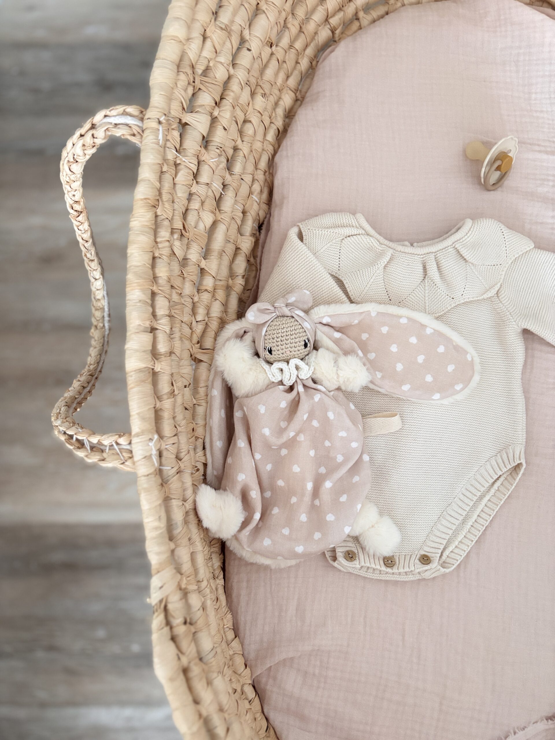 Chaque doudou est réalisé entièrement à la main, et est donc unique, il se peut donc que le doudou que vous recevrez présente des petites différences avec le doudou de la photographie.