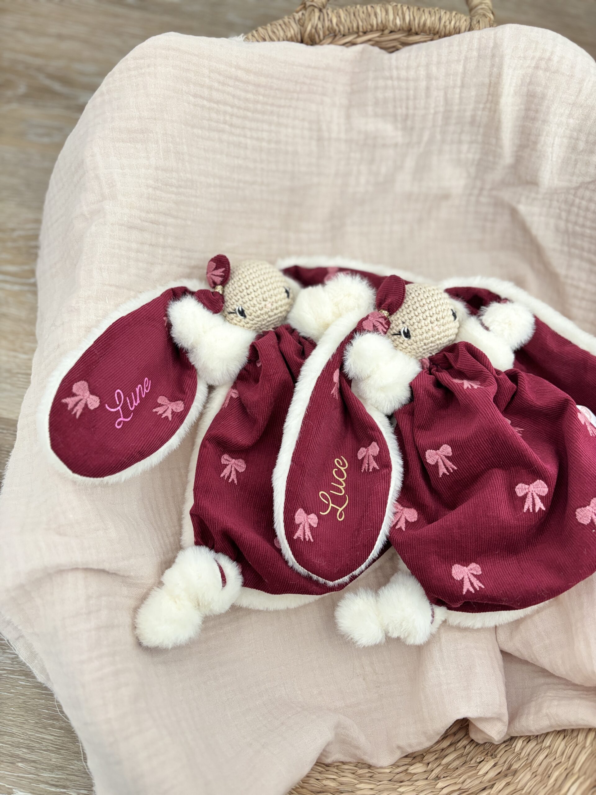 Chaque doudou est réalisé entièrement à la main, et est donc unique, il se peut donc que le doudou que vous recevrez présente des petites différences avec le doudou de la photographie.