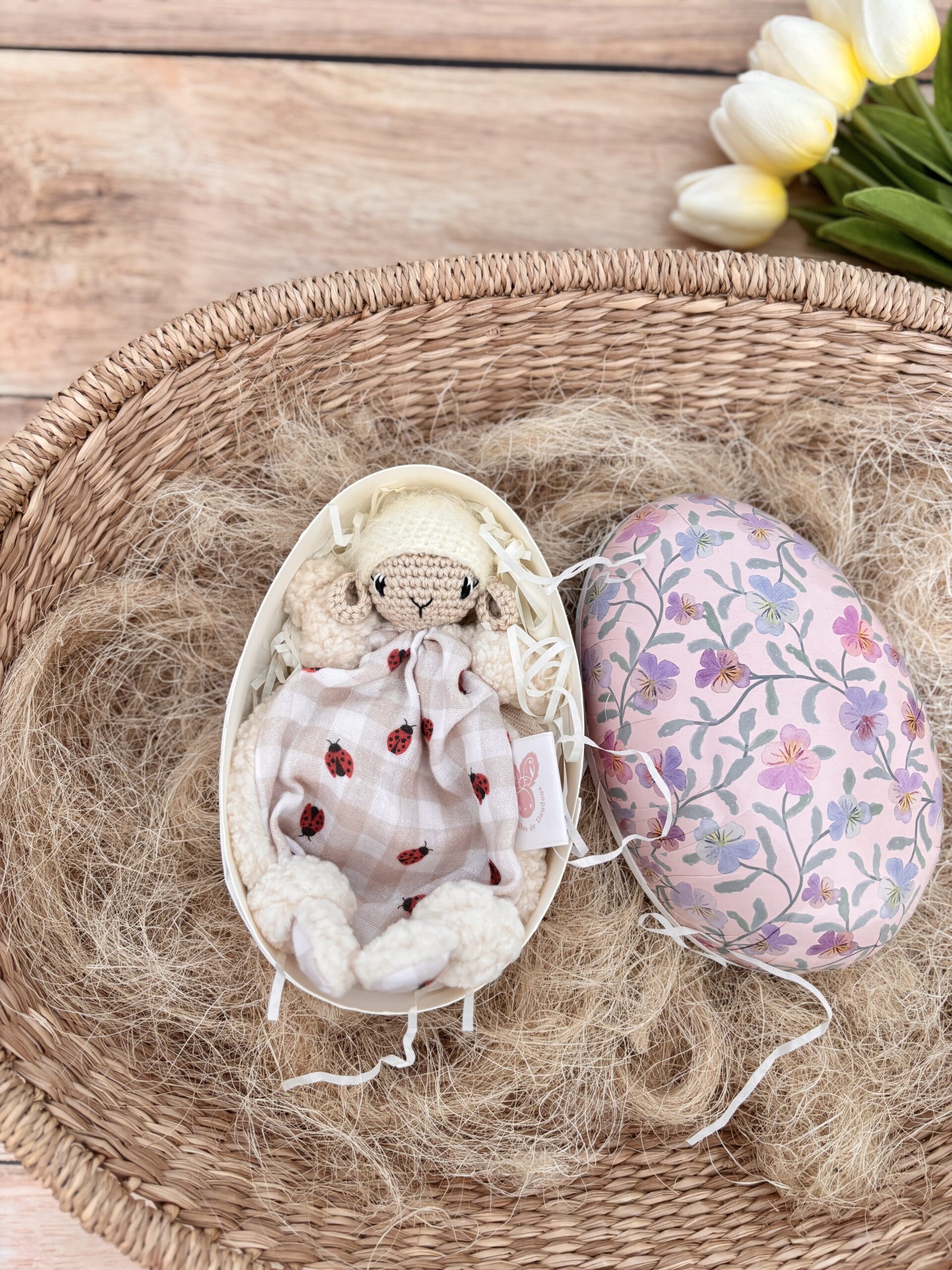 Un joli œuf de Pâques qui renferme un adorable mini mouton tout doux.