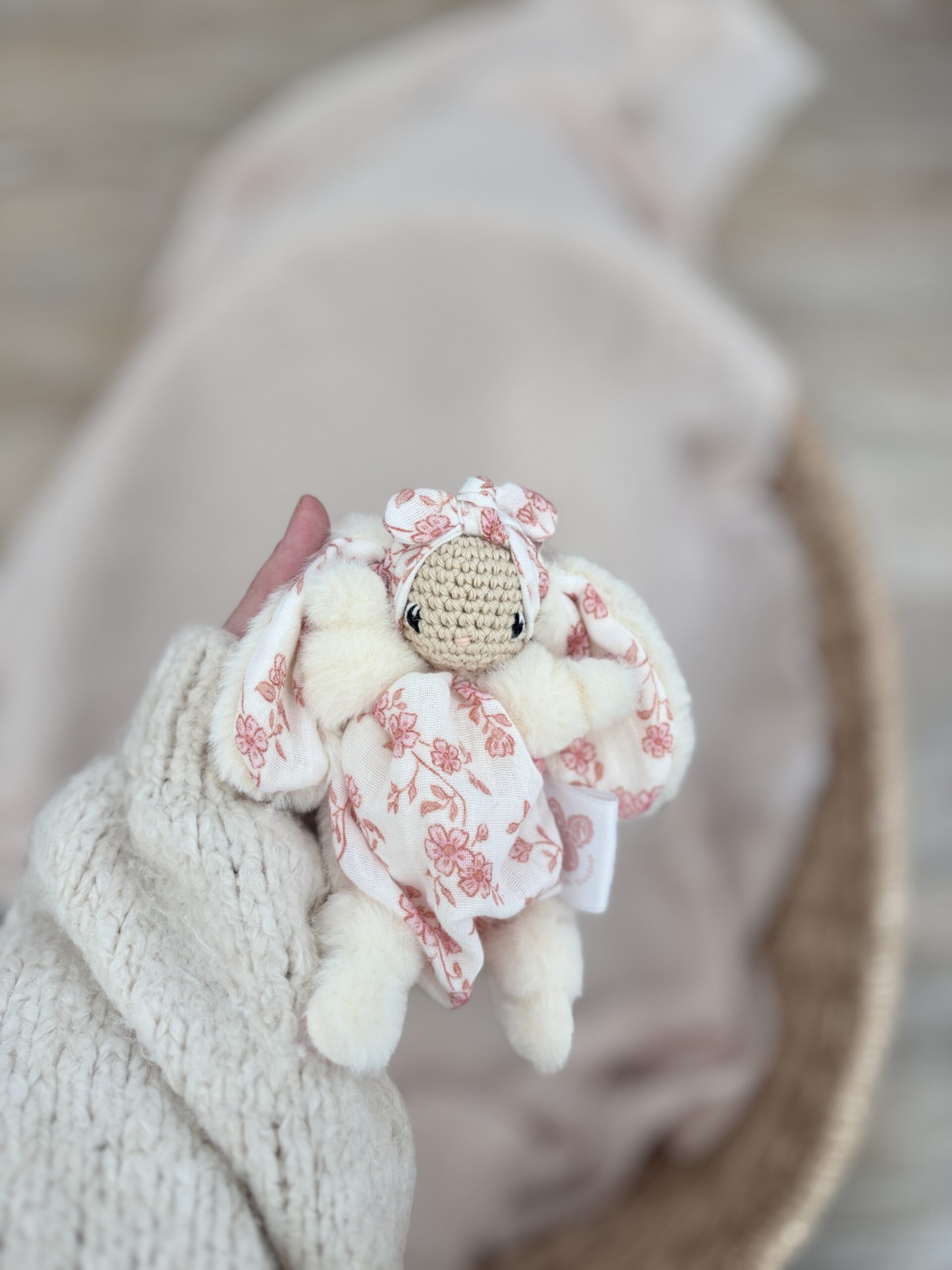 Chaque doudou est réalisé entièrement à la main, et est donc unique, il se peut donc que le doudou que vous recevrez présente des petites différences avec le doudou de la photographie.