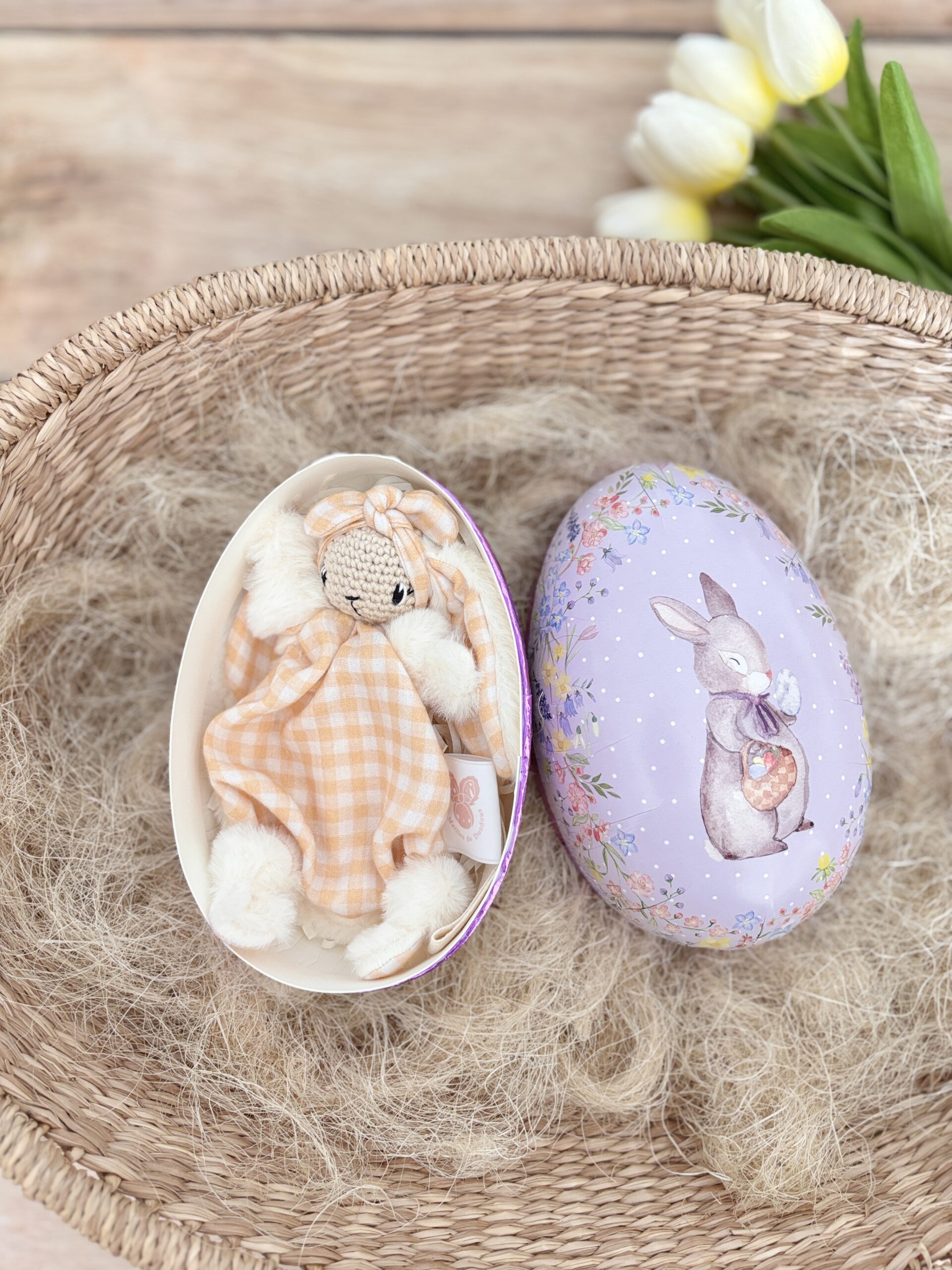 Un joli œuf de Pâques qui renferme une adorable mini lapinette toute douce.