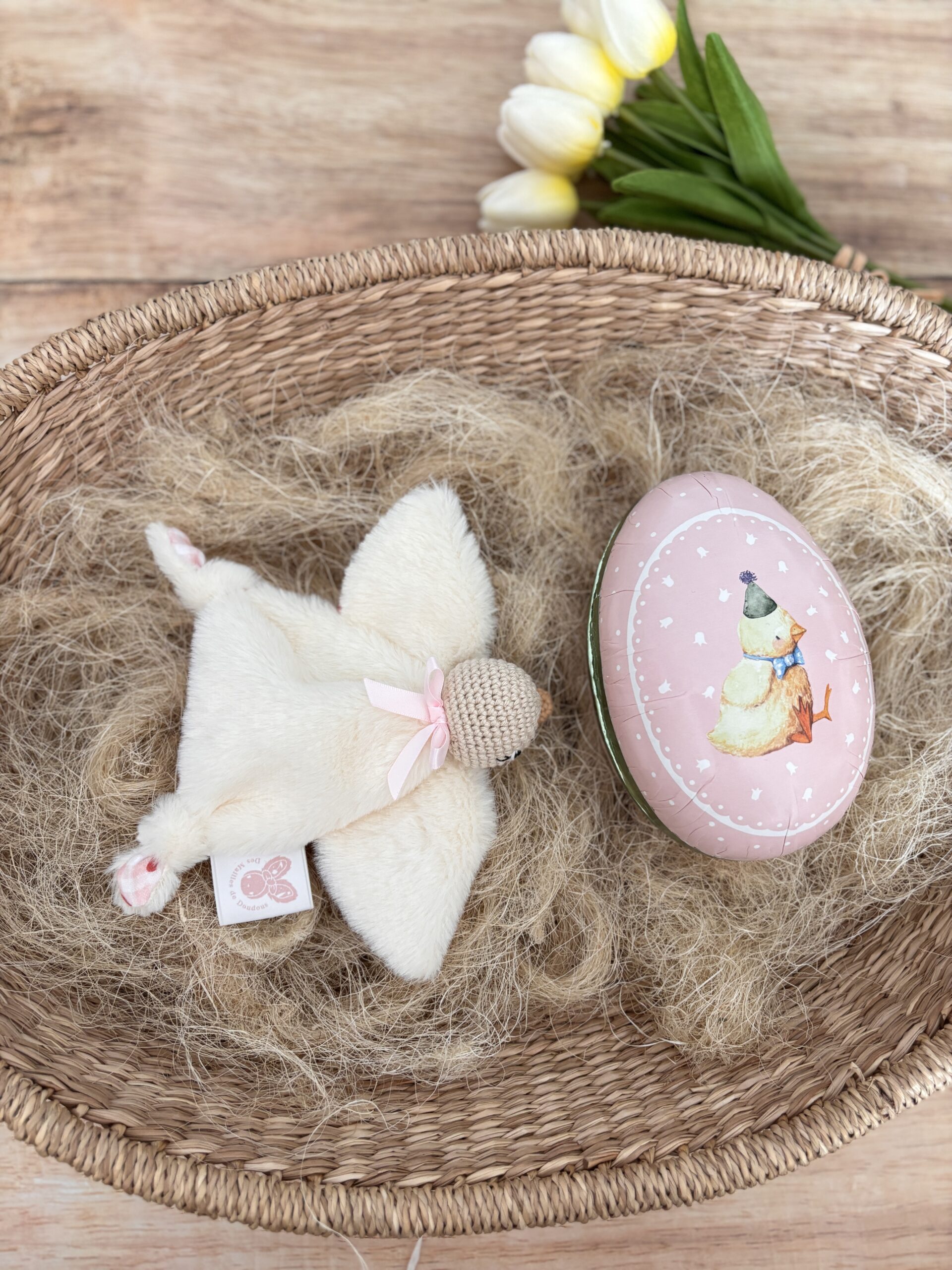 Parfaite comme premier doudou ou petite surprise de Pâques, cette mini oie accompagnera bébé bien après les fêtes.