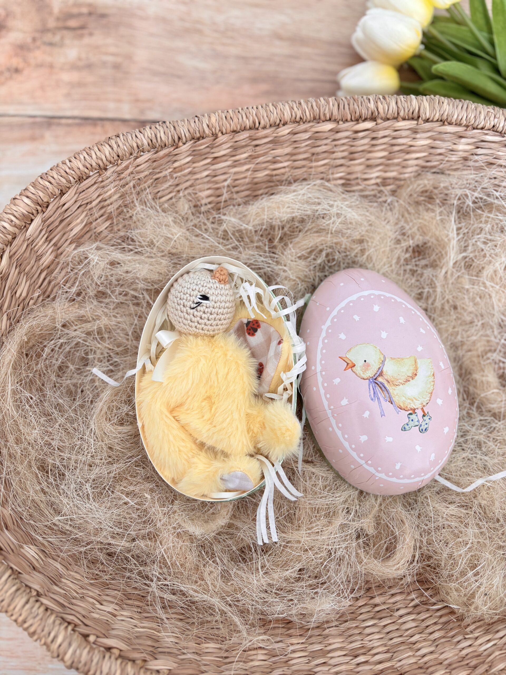 Un joli œuf de Pâques qui renferme un adorable mini poussin tout doux.