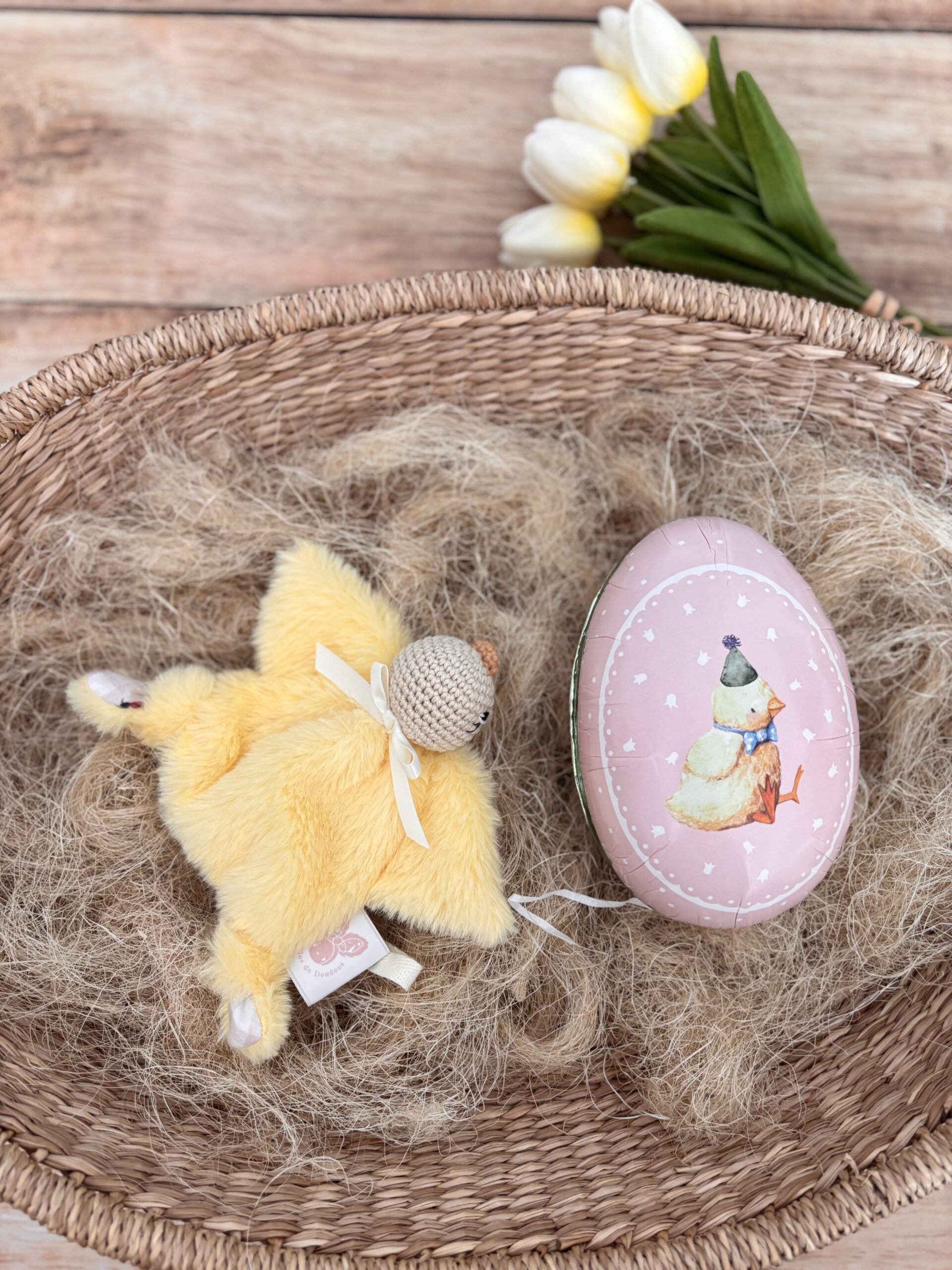 Parfait comme premier doudou ou petite surprise de Pâques, ce mini poussin accompagnera bébé bien après les fêtes.
