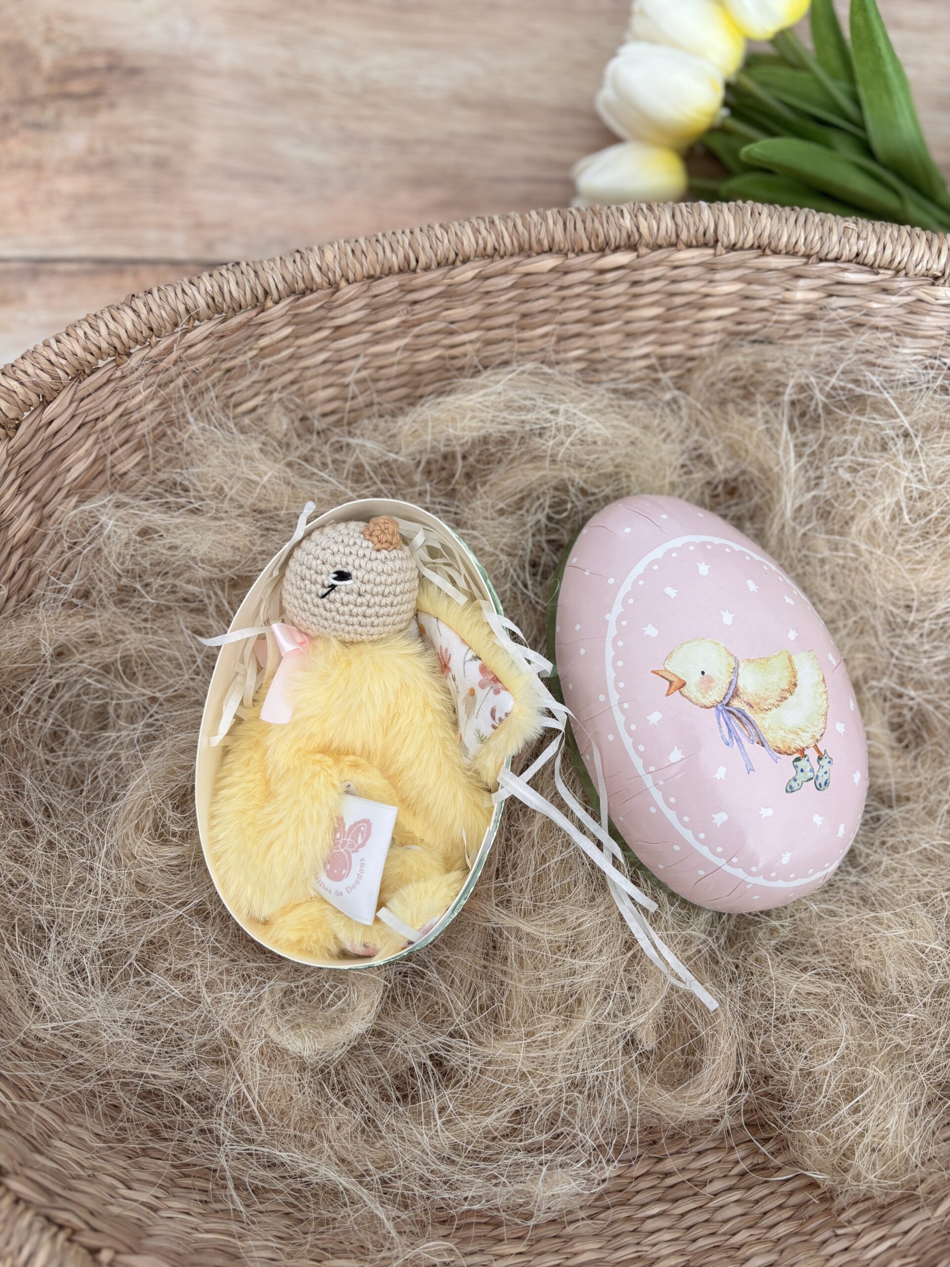 Un joli œuf de Pâques qui renferme un adorable mini poussin tout doux.