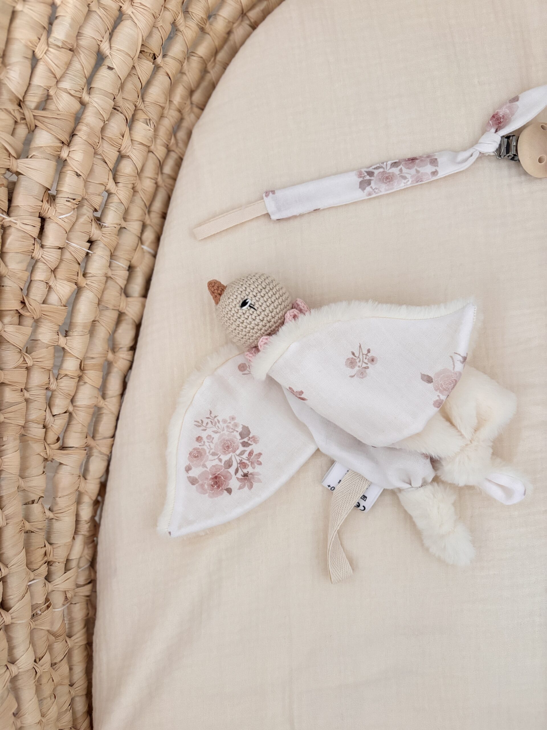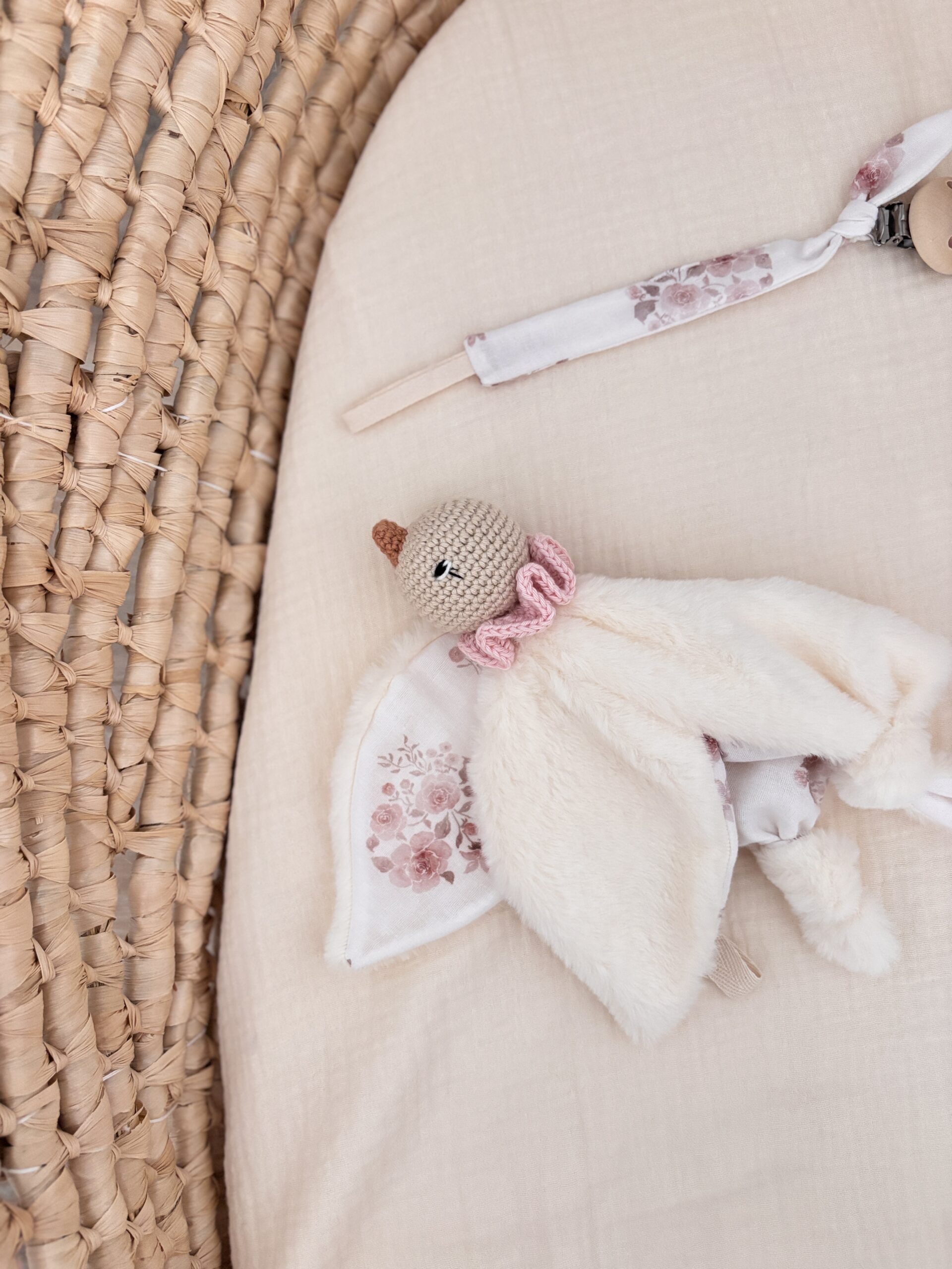 Chaque doudou est réalisé entièrement à la main, et est donc unique, il se peut donc que le doudou que vous recevrez présente des petites différences avec le doudou de la photographie.