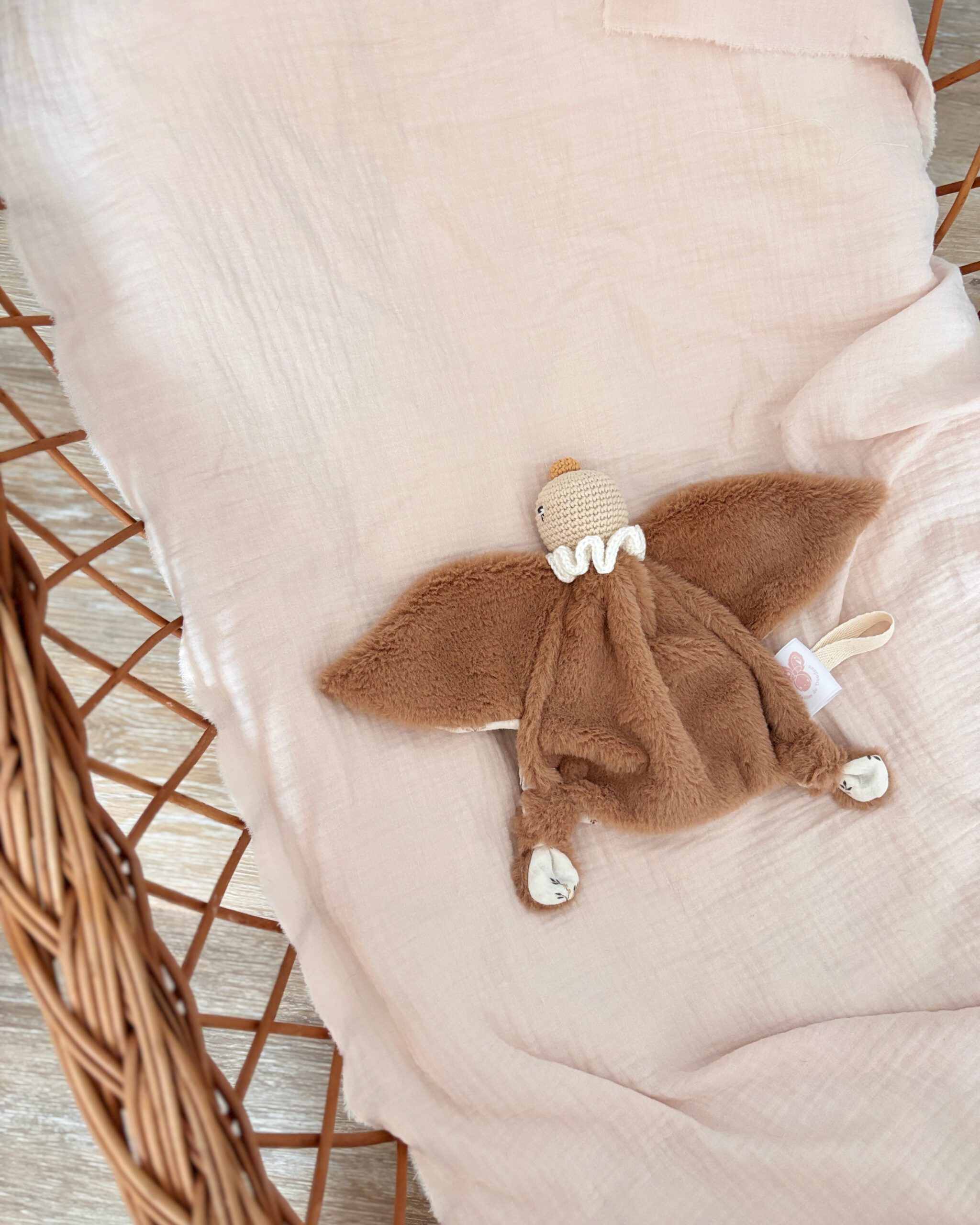 Chaque doudou est réalisé entièrement à la main, et est donc unique, il se peut donc que le doudou que vous recevrez présente des petites différences avec le doudou de la photographie.