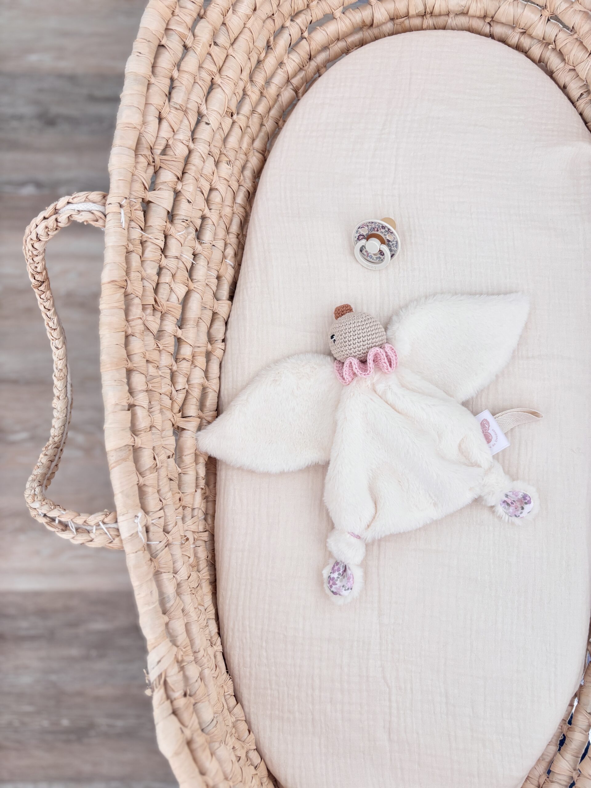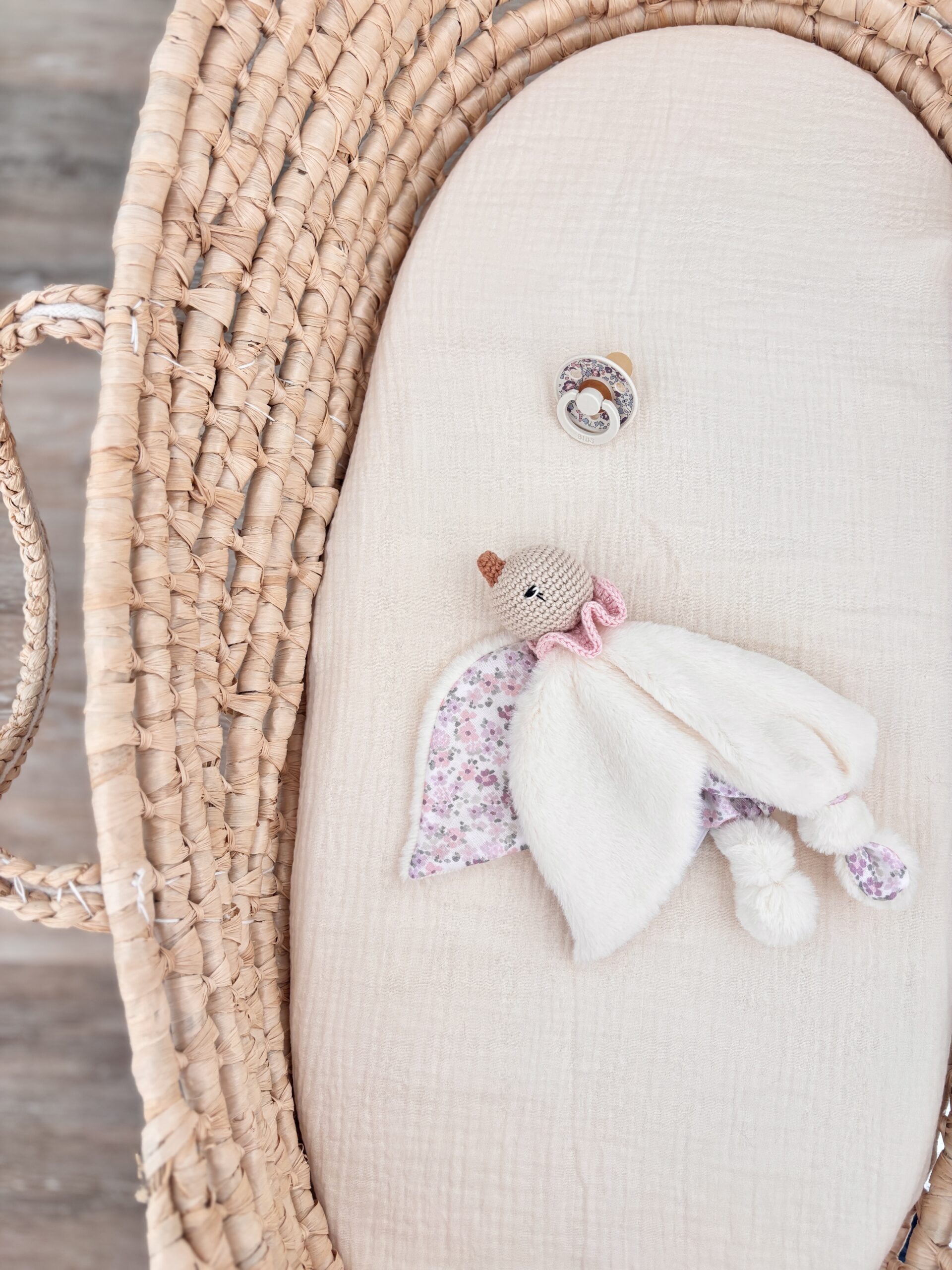 Chaque doudou est réalisé entièrement à la main, et est donc unique, il se peut donc que le doudou que vous recevrez présente des petites différences avec le doudou de la photographie.