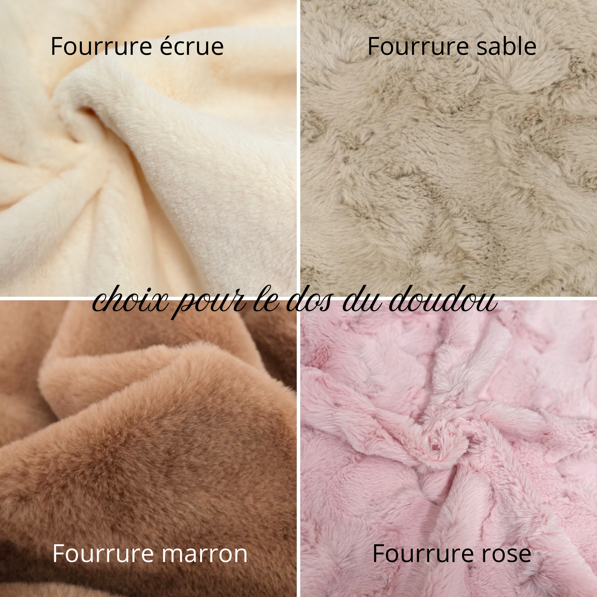 Chaque doudou est réalisé entièrement à la main, et est donc unique, il se peut donc que le doudou que vous recevrez présente des différences avec le doudou de la photographie.