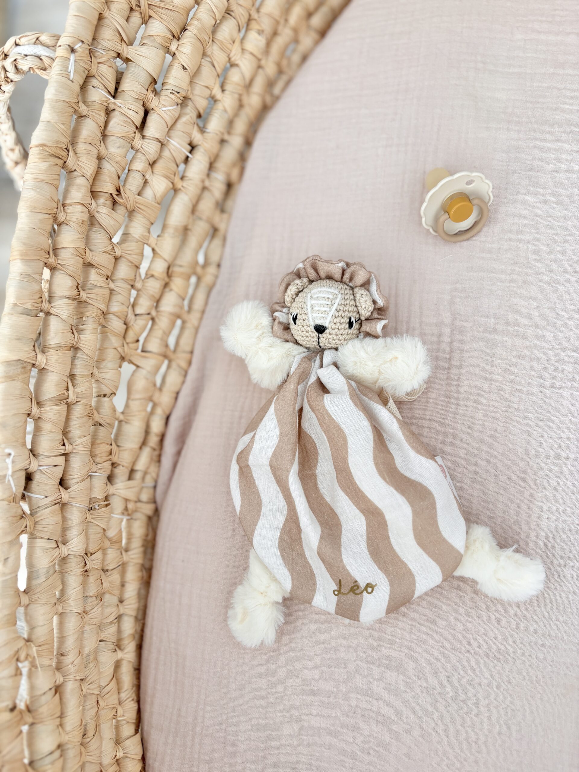 Chaque doudou est réalisé entièrement à la main, et est donc unique, il se peut donc que le doudou que vous recevrez présente des petites différences avec le doudou de la photographie.