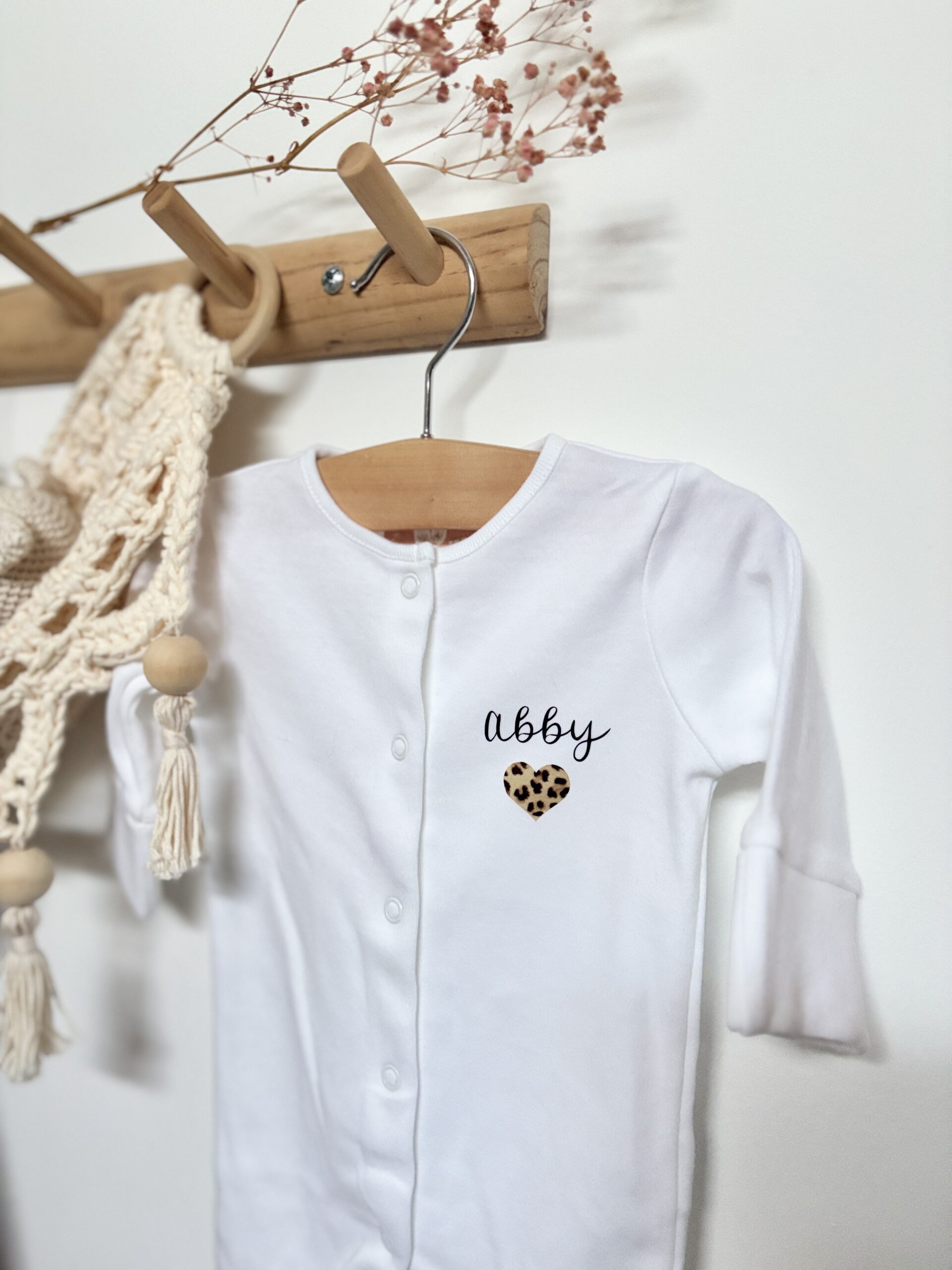 A personnaliser avec le prénom ou le surnom de bébé (plusieurs couleurs disponibles : Noir, Or, Doré pailleté) et avec ou sans le petit coeur léopard