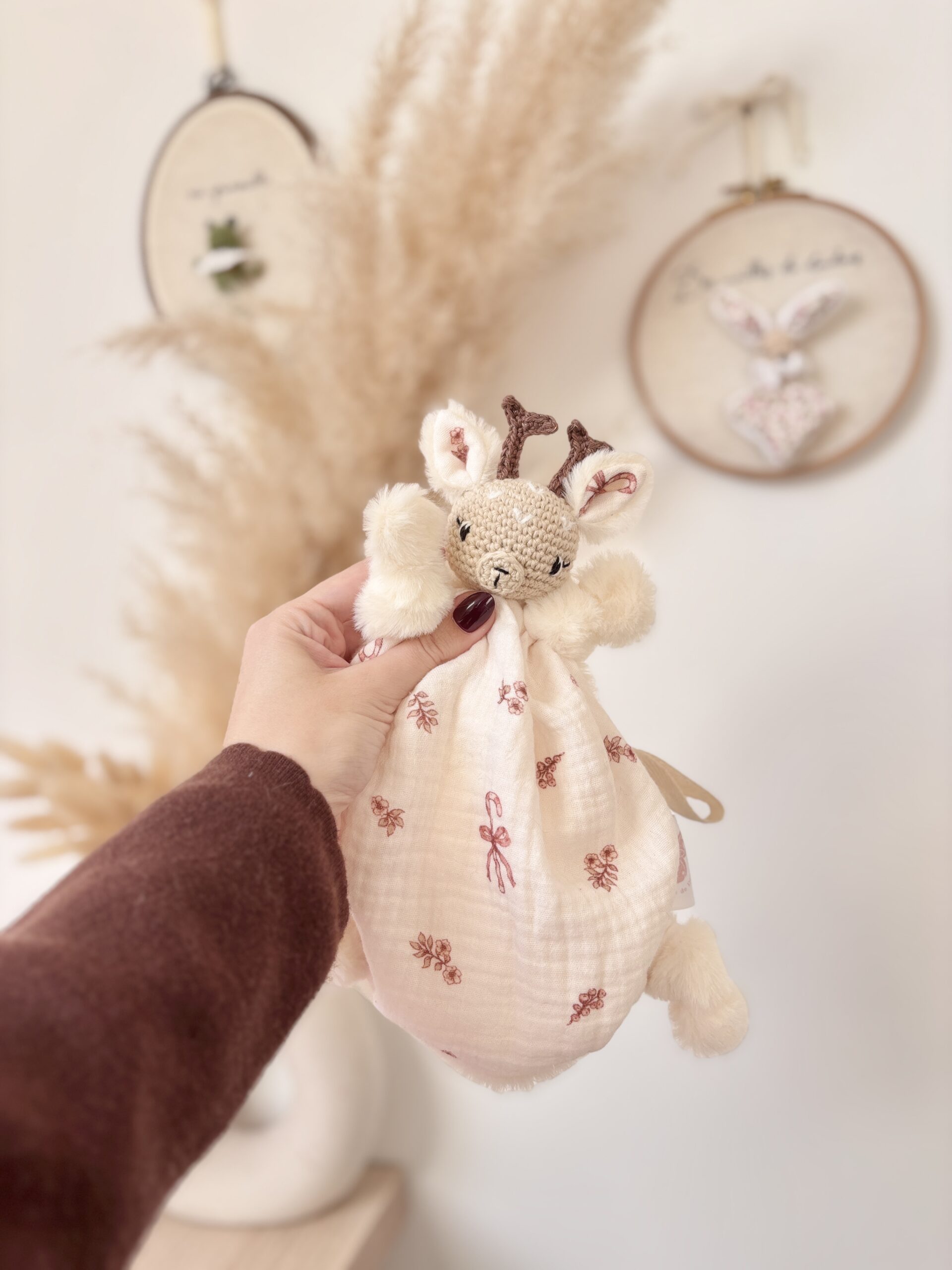 Chaque doudou est réalisé entièrement à la main, et est donc unique, il se peut donc que le doudou que vous recevrez présente des petites différences avec le doudou de la photographie.